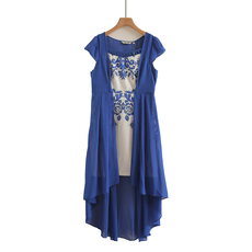 特价 舒适雪纺时尚印花拼水溶花边圆领短袖修身甜美夏季连衣裙