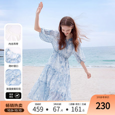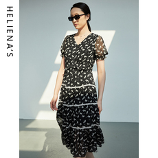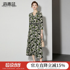 海兰丝浪漫印花裙雪纺收腰连衣裙2024夏新款中长款裙子设计感