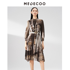 MEDECOO/墨蒂珂春季新款木耳花边立领印花雪纺连衣裙MHC90409
