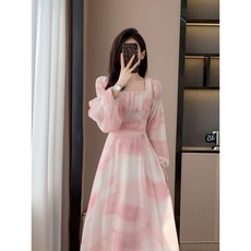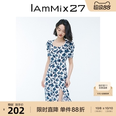 IAmMIX27夏季方领连衣裙女高腰显瘦侧开衩轻薄印花雪纺裙女中长裙