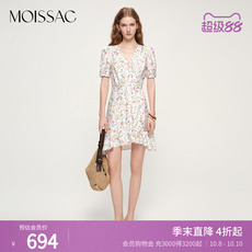 摩萨克春夏法式V领荷叶边收腰雪纺纱混纺印花连衣裙女