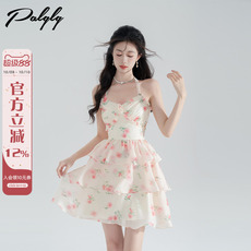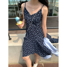 yesyellow 韩系夏季无袖碎花雪纺吊带连衣裙时尚印花度假沙滩裙