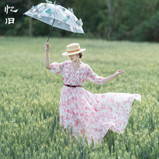 6折【花颜梦】文艺雪纺连衣裙女夏季泡泡格印花度假长裙V领简约