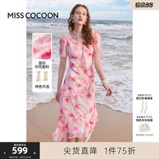 可可尼COCOON 2025夏季新款度假印花裙子多巴胺荷叶边雪纺连衣裙