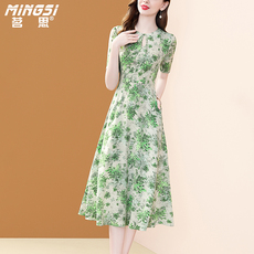 茗思时尚印花茶歇连衣裙女夏季2024新款气质优雅收腰显瘦雪纺裙子