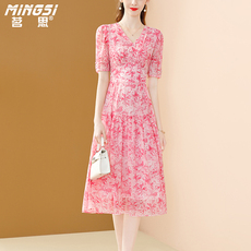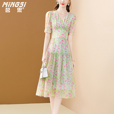 茗思印花雪纺连衣裙女夏季2025新款气质法式V领收腰显瘦碎花裙子