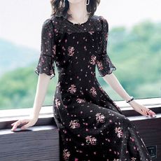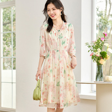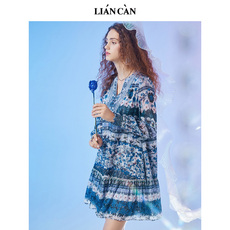 莲灿碎花时尚春季宽松减龄A字国风印花雪纺长袖连衣裙7121424004