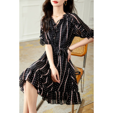 高斯雪岚2024夏装新款复古波点雪纺连衣裙印花系带减龄小清新a裙
