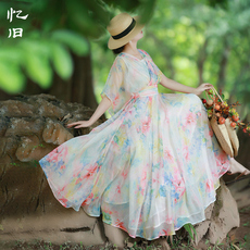 5折【花攒绮簇】夏季雪纺大摆连衣裙仙气飘逸长裙女V领印花裙子