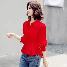 衬衫女前短后长上衣日系少女士减龄红色洋气小衫褂收腰遮肚雪纺衫