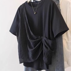 夏季修身显瘦不规则系带条纹撞色缎面小衫女短袖上衣中长款雪纺衫