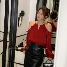 锁骨上衣甜美超仙一字肩 荷叶边别致小衫 宽松遮肚薄款凉快雪纺衫