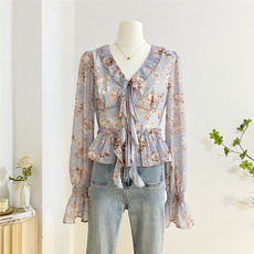 法式V领荷叶边碎花雪纺衫长袖衬衫女春季设计感短款收腰小衫上衣