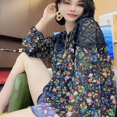 欧货2025年夏季新款蕾丝拼接碎花雪纺衫女宽松大码遮肉长袖小衫黑