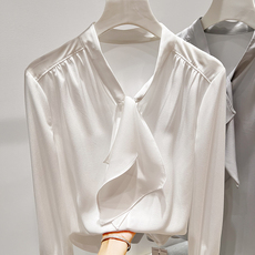2025秋季新款蝴蝶结系带雪纺衬衫女长袖宽松垂感缎面上衣气质衬衣