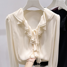 2025新款法式气质V领木耳边钉珠系带纯色长袖雪纺衫女秋薄款上衣