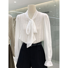 Sun雅乔【早秋coco】早秋新款薄衬衣蝴蝶结珍珠雪纺长袖白衬衫女