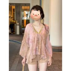 法式蝴蝶结碎花露肩长袖挂脖衬衫女早秋松弛感慵懒小心机雪纺上衣