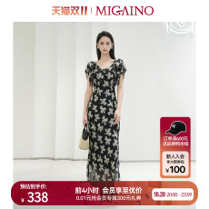 Migaino曼娅奴女装秋季新款设计感蝴蝶结印花收腰雪纺中长连衣裙