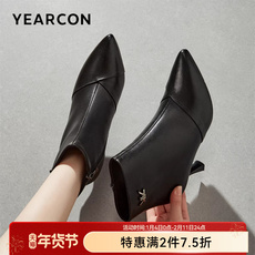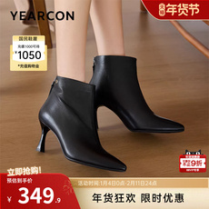 意尔康女鞋冬季真皮加绒短靴羊皮尖头细跟法式气质及踝靴女士皮鞋