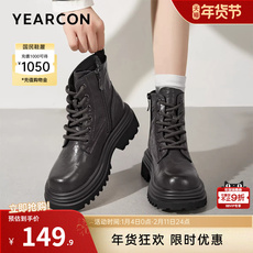 意尔康女鞋冬季复古户外休闲加绒马丁靴粗跟英伦风短靴小个子女士