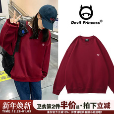潮牌美式复古红色连帽套头卫衣女春秋季韩版时尚宽松显瘦百搭上衣