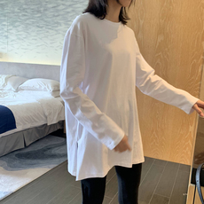 棉质t恤女秋冬休闲内搭中长款韩版宽松大码纯白打底长袖上衣开叉