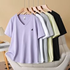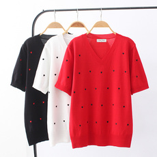 2023夏季韩版新款大码女士休闲上衣胖MM宽松V领桃心刺绣针织T恤