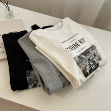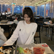 韩版时髦白色字母印花圆领长袖T恤女宽松慵懒风落肩上衣2023秋季