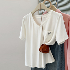 V领露锁骨短袖T恤女夏季2025新款宽松韩版口袋蝴蝶结刺绣半袖上衣