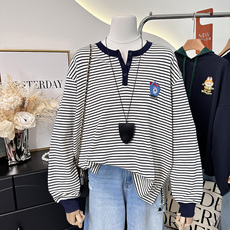 小个子正肩短袖t恤女夏季2025新款韩版宽松polo领假两件条纹上衣