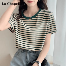 拉夏贝尔撞色条纹短袖T恤女夏正肩2025新款韩版宽松显瘦圆领上衣