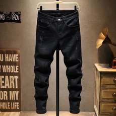 秋冬款网红裤子男韩版潮流修身型小脚裤潮牌黑色紧身牛仔裤男长裤