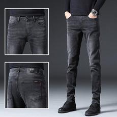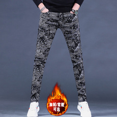 高端2024秋冬加绒黑色印花牛仔裤男潮牌修身小脚韩版潮流休闲裤男