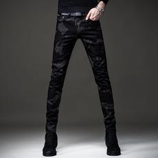 巴宝绅秋冬新款男士牛仔裤数码印花韩版弹力修身小脚长裤子纯黑色
