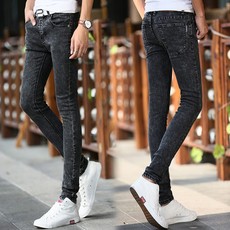 春秋季新款高端潮牌水洗条纹牛仔裤男修身小脚黑色韩版弹力长裤男
