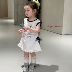 女童夏装新款无袖连衣裙2025女宝韩版卡通印花简约蕾丝拼接花边裙