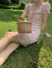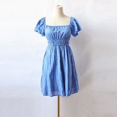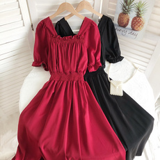 2022春夏新款法式气质甜美纯色方领泡泡袖修身显瘦中长款连衣裙女