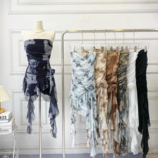 灰色韩版复古印花吊带连衣裙女夏季新款不规则网纱拼接无袖a字裙