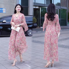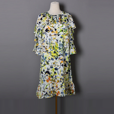 春夏韩版碎花连衣裙法式荷叶边圆领宽松显瘦直筒长袖印花连衣裙