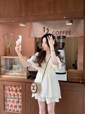萌萌Ja」白露 荷叶边v领纯欲风连衣裙韩版高腰雪纺a字短裙夏新款