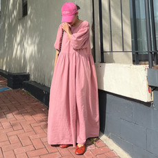 夏装新款棉麻过膝长款娃娃连衣裙女韩版宽松大码时尚休闲慵懒风裙