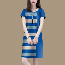 2025夏季圆领短袖连衣裙印花韩版条纹时尚百搭宽松显瘦拼接中长裙