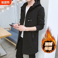 秋冬外套男加绒风衣中长款连帽夹克潮流披风韩版修身保暖冲锋衣男