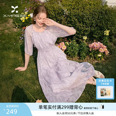 香影紫色雪纺印花连衣裙2025夏装新款欧若风打揽收腰度假方领裙子