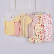大量现货澳洲设计感粉色印花重工水钻修身衬衫+半身裙+吊带套装