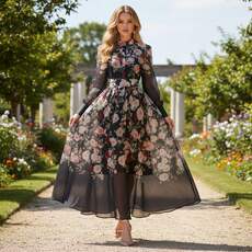 2025秋季佩斯利定位印花玫瑰花半松紧腰大裙摆套装裙两件套