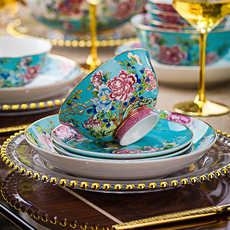中式碗碟套装家用宫廷风碗珐琅彩中式金边陶瓷碗骨瓷餐具盘碗套装