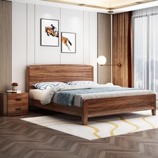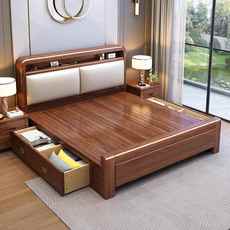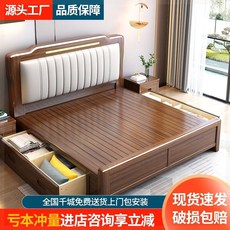 胡桃木色全实木床1.8米双人大床现代简约1.5米单人抽屉高箱储物床