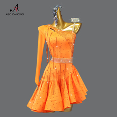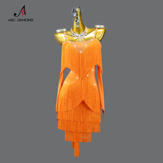 2025新款橙色专业拉丁舞流苏连衣裙高级比赛表演服装长袖儿童定制